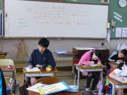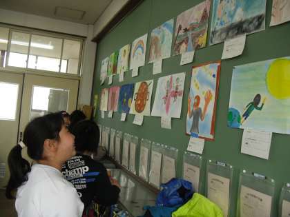 「心に浮かぶ世界」の鑑賞をしました。友達の作品を見て,素敵なところを話し合った後,一番好きな作品に自分なりの「題名」をつけたりして,描いた人の世界を感じられたか,作品の世界を感じ取れたかを視点にして感想を書きました。