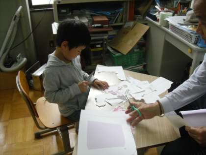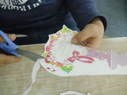 花束の柄のカードを切り抜いて,そこへメッセージを書いていきます。