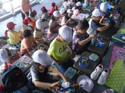 イルカショーの後は、待ちに待ったお弁当タイムでした。「いただきます。」をしてふたを開けた瞬間、子どもたちの笑顔が広がりました。たくさん歩いておなかがすいていた子どもたち。「おいしかった!」とあっという間に食べきってしまう子が多かったです。