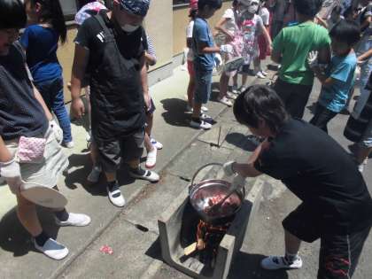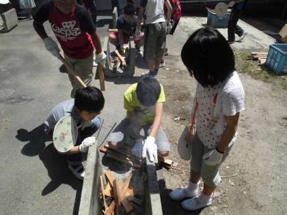 調理係の作ってくれた材料を炒めるために,火係もがんばって薪に火をつけたり,火力を維持する仕事を頑張りました。汗をかきながらも一生懸命協力して取り組む様子がすてきでした。