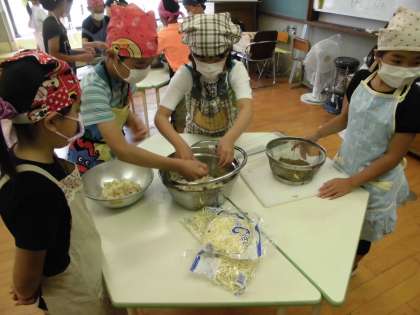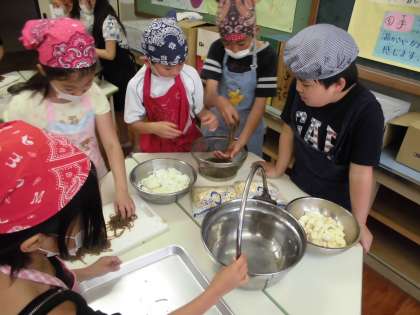 やる気まんまんの調理係さんでした。玉ねぎを切っているときは、ぼろぼろ涙を流しながら「お母さんの大変さがわかった。」と実感たっぷりの子ども達でした。