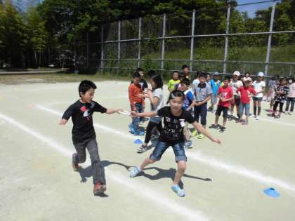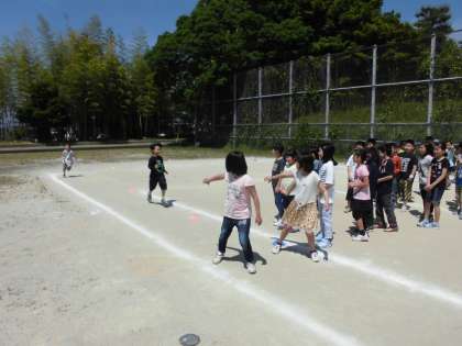 5月に入って,日差しの強い日が増えてきました。そんな暑さに負けず,子どもたちは休み時間になると外で元気に遊んでいます。今日は,みんな遊びでリレーをしました。