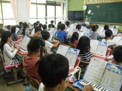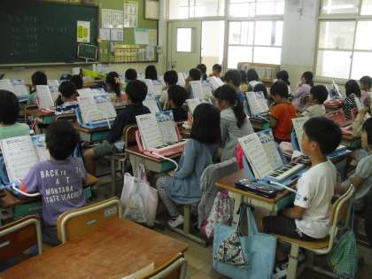 音楽の時間「海風きって」の曲で,2小節の旋律をつくり(3つの音から自分で選んでつくるようになっています),歌と鍵盤ハーモニカの演奏を重ねてみました。自分の旋律と友達を合わせて演奏してもうまく重なるようになっていることがわかりました。