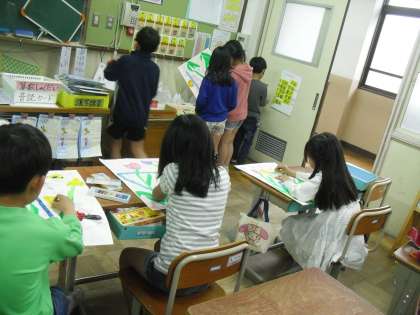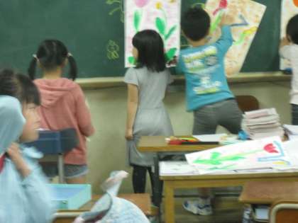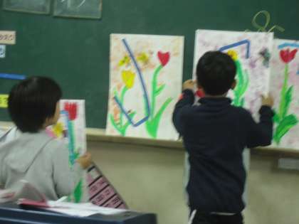 図工科で4月に描いた『春を描こう』のチューリップの絵を「計量の絵につくりかえよう」というめあてで計量の絵に取り組んでいます。虫たちが,チューリップの大きさを測ろうしている様子をあらわしています。自分の絵を離れて見てみて,出来上がりを確認しています。