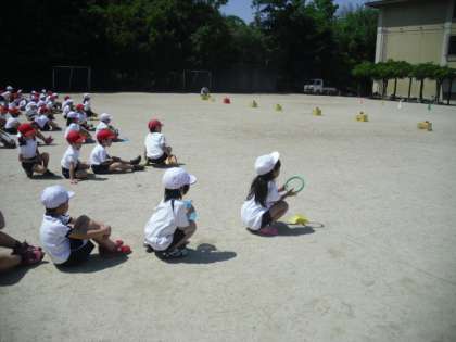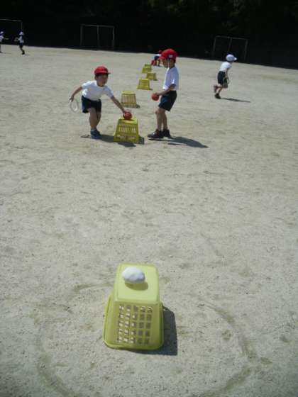 今日の体育ではリレーをしました。バトンは輪っかを使いました。最初は簡単にコーンの周りをまわり,回を重ねるごとに玉をかごの上に置くなど,パワーアップして進めていきました。座って待つ,応援するなど,楽しくルールを守ってできました!