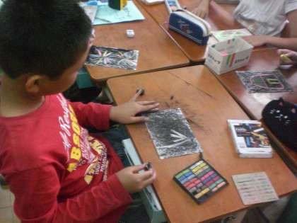 画用紙をコンテで塗りつぶし,消しゴムで消すと形が生まれてくることを楽しみながら,塗ったり消したりして,表したいことを見付けていきました。チョークで他の色を重ねたり,あえて軽く消してぼかしたりするなど,様々な方法で楽しんで作品をつくりあげました。
