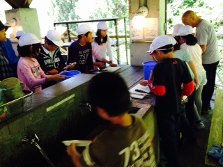 先生に教えてもらい、はさみを使って内臓を取り出します。