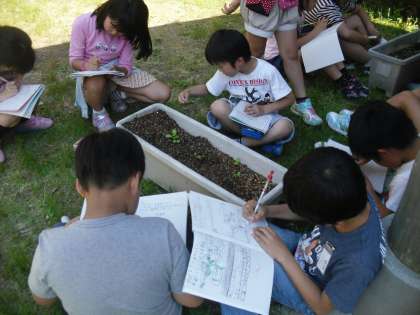 先日植えたホウセンカですが,今日は子葉が出てきた様子を観察しました。