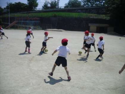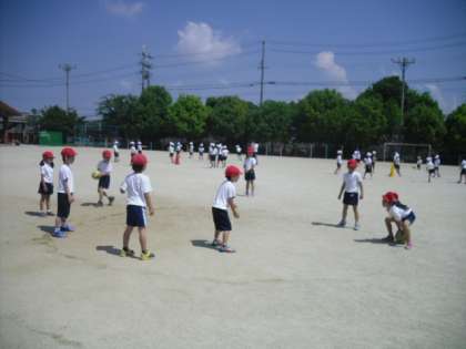 体育の時間,チームに分かれてころがしドッジボールをしました。最初はルールがわからなくて困っていた子も体育の時間が終わるころには楽しそうにゲームを楽しんでいました。