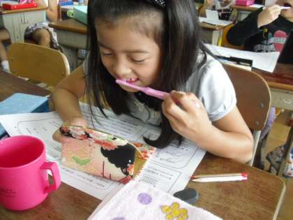 今日は,普段どれだけ歯磨きがしっかりできているか,カラーテスターを使って確かめました。