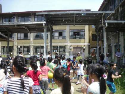 中間休みに,2年生をむかえてシャボン玉やさんをしました。