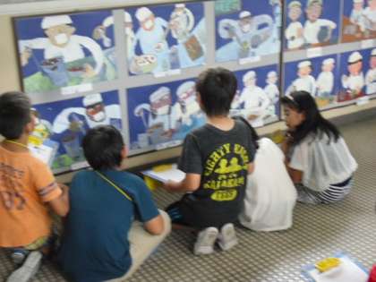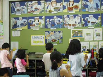 先日完成した「給食当番の自分」の絵を鑑賞しました。「色使いや形」「人物の表情」などに注目し、ステキを見つけ合いました。「色の塗り方がくふうしてあって立体感がありました。」「おかずの色がとてもおいしそうで食べたくなるぐらいでした。」など作品をしっかりと味わった思いが文章に表れていました。