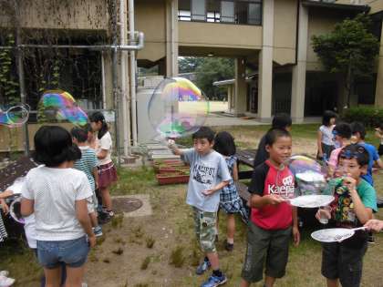 今日,中間休みに,たけのこ学級が主催してくれた「しゃぼん玉屋さん」に4年生の希望者が参加しました。ストローやうちわなどを使って,小さいものから大きいものまで大小様々な大きさのしゃぼん玉を楽しそうにたくさん作っていました。子どもたちの無邪気な表情がかわいらしかったです。
