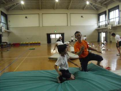 どのクラスも意欲的に新しい技に挑戦してくれました。前方倒立回転といった新しい技に加え,発展的な学習としてバク転にも挑戦しました。自分で限界を決めずに,どんどん成長していってほしいと思います。慣れてくるまでは,ウレタンマットの上で補助を付けて安全に行いました。