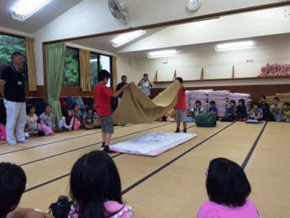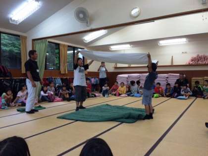 オリエンテーションの中で、布団、シーツ、シュラフの使い方しまい方を教えてもらってます。