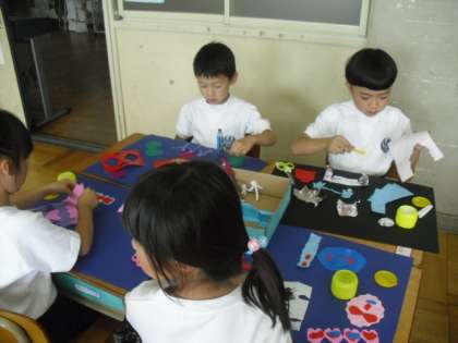 休日参観で作ったちょきちょきかざりの作品を,画用紙に貼りました。べったりと貼るだけではなく,少し浮かせたり斜めにずらしたりはみだしたりしながら,自分だけの作品にすることができていました。今日は完成までいかなかったので,月曜日に完成させたいと思います。また教室の後ろに掲示する予定です。