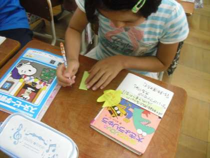今日は友達のつくった「本の帯」を見て,感想を付箋に書いて交流しました。自分の作品に対するコメントを読んだ子どもたちは,とても嬉しそうでした!