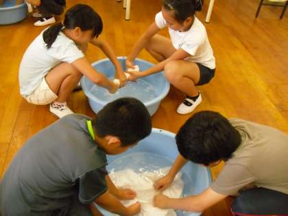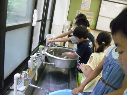 1組の手洗いは,今朝の朝ランで汚れた「泥のはね」を,つまみ洗いできれいに落としていました。洗濯機で落ちない汚れが,手洗いでは本当にしっかり落ちることに驚きがあったようです。