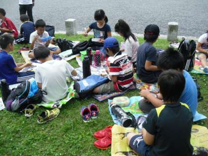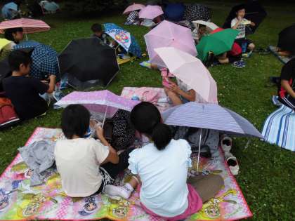 お昼は京都御所でお弁当を食べました。朝から降っていた雨もやみ,「今がチャンス!」とばかりに食べ始めた瞬間,ぽつぽつと雨が・・・。みんなあわてて傘をさして食べました。その後は,雨も上がりましたが,なかなか大変な昼食になりました。