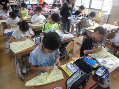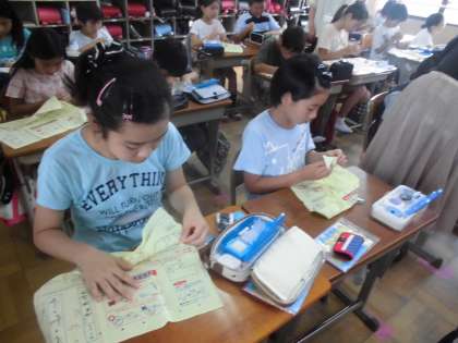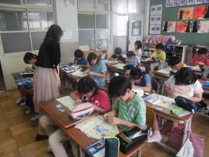 家庭科の学習では,「なみぬい」の学習に入りました。最初の頃は苦戦していた「玉結び・玉どめ」も,練習を重ねるにつれ,上手になってきました。今日の「なみぬい」もスムーズに進める人が多く,子ども達は黙々と取り組んでいました。次はボタン付けにも挑戦していきます!