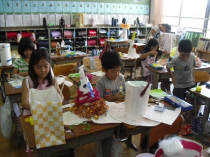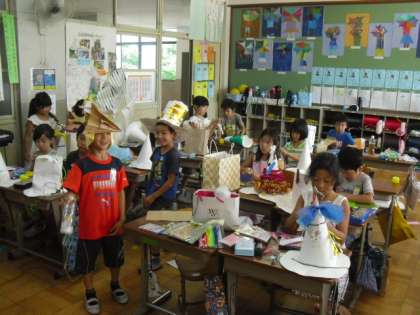 家から持ってきた材料を元に,楽しい帽子に仕上げています。
