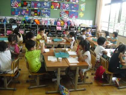 5時間目の生活の時間に,あさがおの花から色を絞り出して色水を作りました。少し水を足してもんでみると,じわじわと色が出てきておもしろかったです。色水をカップの中に入れて,和紙の端をつけると,薄い色や濃い色など様々な色がでてきてきれいでした。あさがおさん,元気に大きく育ってくれてありがとう!