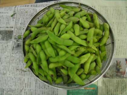 頑張った甲斐あってざるいっぱいの枝豆を収穫できました。