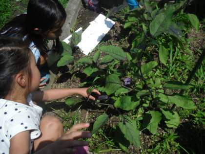 第二グラウンドの畑で育っている野菜を子どもたちと収穫しました。