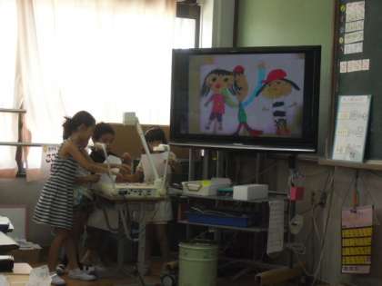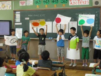 画用紙に描いたものを見せたり,ペープサートで大きく映したりと,いろいろな工夫をしながら伝える練習をしています。