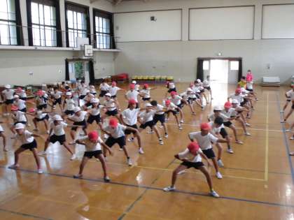 今日からソーラン節の練習を始めました。最初に見本の映像を見てイメージを持ち,その後,少しだけですが踊りを練習しました。終わった後,「たったこれだけやのに,めっちゃ汗かいた〜!」とか「足痛い〜!」とかいう声が早速上がっていました。これから運動会本番に向けてがんばっていきたいと思います。