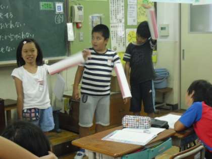 手指やひじを固定するように画用紙の筒をはめてみて、出来なくなることをどんどん出し合いました。