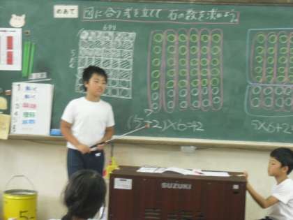 式の計算の順番にはきまりがあることを知りそれを使って計算したり、図に合う式のつく方を考えたりして、学習を進めています。
