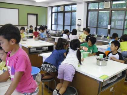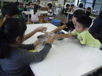 予想した後,紙コップを使って紙コップに何杯分かで比べました。