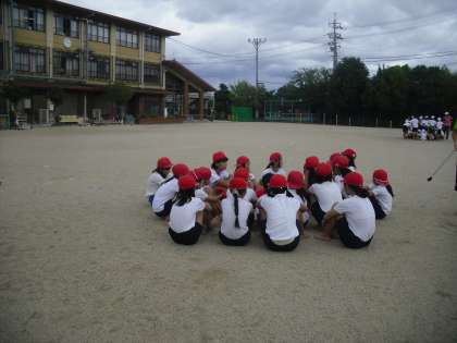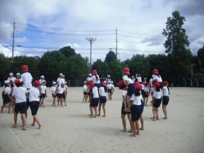 今日は運動場で騎馬戦の練習をしました。赤も白も,とてもいい勝負をしいています。