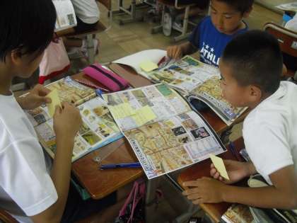 社会科では、資料を根拠にしながら互いの意見を交流します。
