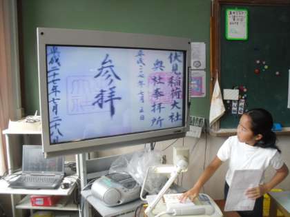 朝のスピーチでは,それぞれのおすすめのものを紹介しています。今日は「御朱印帳」について紹介してくれました。みんなに伝わりやすいように考えて,実際に使っている貴重なものを大画面にうつして,紹介してくれました。聞く人が分かりやすいように考えて,発表する姿がすばらしかったです。分かりやすかったので,質問や感想もたくさん言ってくれました。