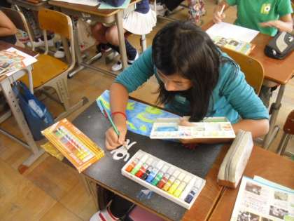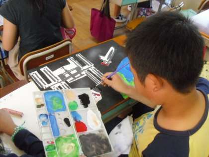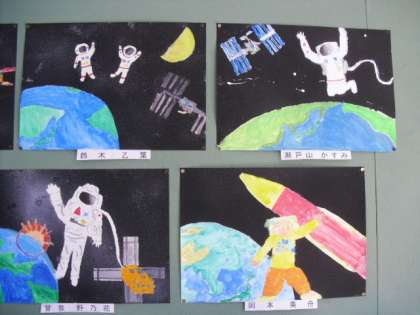 「宇宙への夢,力いっぱい」のお話の絵が完成しました。宇宙での楽しい実験の話から想像をふくらませて描きました。