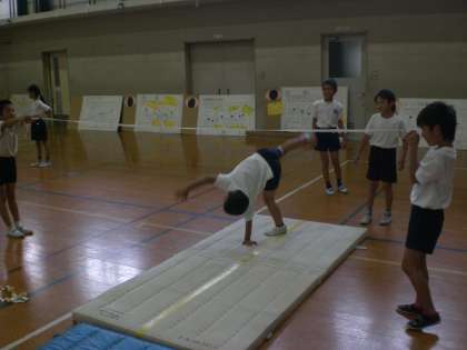マット運動の学習では,自分のできる技を連続で回ったりできそうな技にチャレンジしたりと頑張って練習しています。