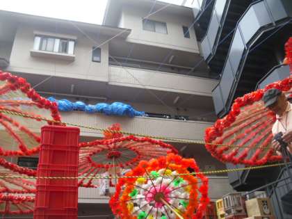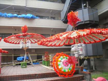 2年生と一緒に、花笠の見学に行きました。御香宮神社の秋祭りが11日にあります。祭りでは、毎年たくさんの花笠が各町内で作られます。その中でも、大中小と、たくさんの花笠を製作されるマンションに行き、そこで、花笠制作の苦労などを聞きました。この花笠やお話を参考に、学校で生活科の学習で、おみこしや花笠を作ります。また、8日には、露店も見学に行きます。