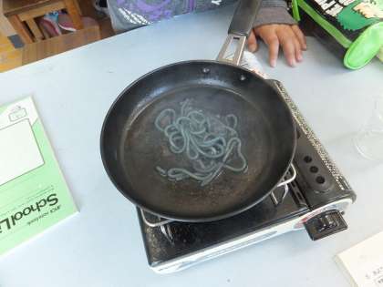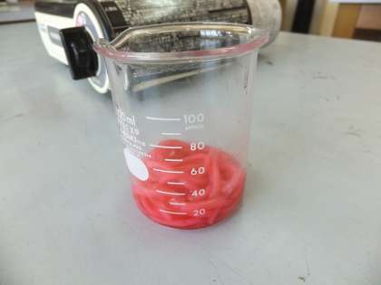ムラサキキャベツ液を使って焼きそばのめんを湯がきました。すると,緑のめんになりました。どうして緑のめんになったのかを話し合った後,塩酸をかけ,赤いめんに色を変化させました。身近な食材を使って酸性・中性・アルカリ性を調べる実験に子ども達は驚きの声をあげていました。
