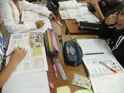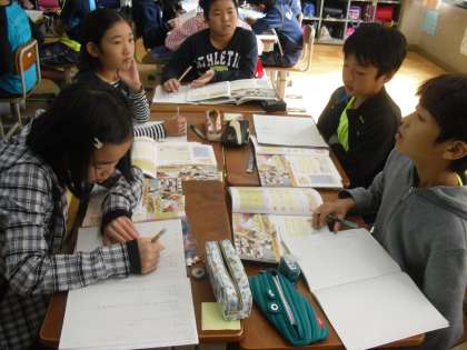 社会科の教科書などを活用しながら,現在の日本の食料生産の問題点について話し合い,グループでの考えを深めていました。