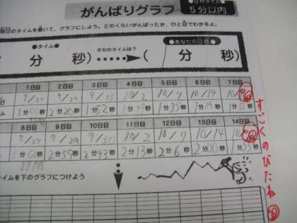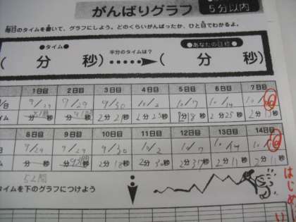 百マス計算が7回終わりました。記録が伸びるのがうれしいようで,チャレンジタイムに他の学習をすると,「百マスがよかった・・・」という声が出るほどです。はじめは3分で百問できなかった子が2分でできるようになるなど,すごく伸びています。ひき算とわり算にも挑戦していきます。