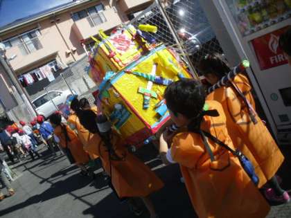 今日の2・3時間目に、1年生といっしょになかよしまつりで校区を練り歩きました。