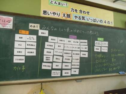 今日の参観授業は道徳「将来の夢」でした。事前に調べておいた「なりたい職業アンケート」をもとに、出てきた職業が「男子」「女子」のどちらの希望によるものかをみんなで考えていきました。子ども達は、「力が必要そう」と感じる職業は「男子」に、「細かい物を作るのは得意そう」「女の子っぽい感じがする」と感じる職業を「女子」に分類していましたが、ほとんどの職業を「どちらとも決められない」と判断していました。
