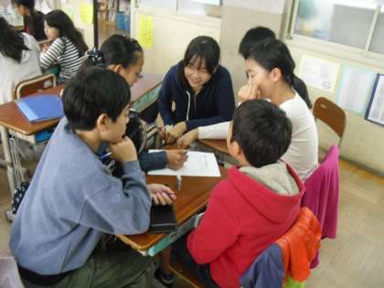グループごとに集まり、学習したことを整理。全学年にわかりやすく伝えるためにどうすればいいか頭をひねります。