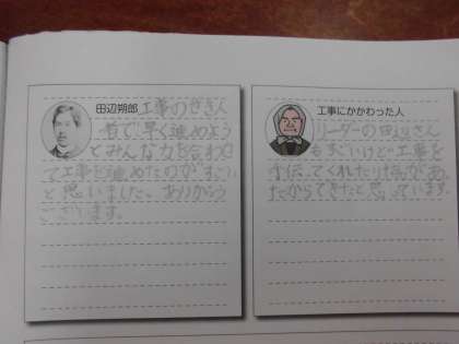 今までの学習と昨日の見学で学んだことをいかして,琵琶湖疏水の学習のまとめをしました。まとめとして,教科書を使って当時の人たちに手紙を書いてみるという学習をしました。「疏水をつくってくれてありがとう!」という思いを書いている子が多かったです。京都に住む一員としてここで学んだ琵琶湖疏水の学習をしっかり身に付けていってほしいと思います。