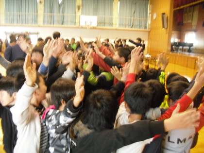 右の写真は学校対抗のゲームの様子です。みごと1位でした。