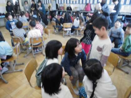 「にわのことり」という教材で道徳の授業を他校の先生たちに見ていただきました。お話を聞いて「たいせつな友達」に対する「優しい心」について3つのグループに分かれて意見を交流しました。