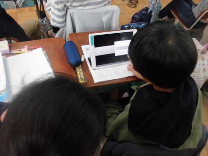 新聞紙を使って実際に体験して考えたり,タブレットで2人の友達の考え方の違いについて考えたり,アナログとデジタルの両方の良さをいかす授業に取り組みました。