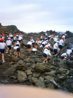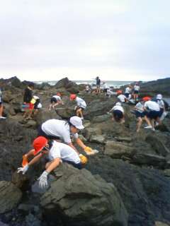 曇り空ですが、みんなは磯観察に大はりきりで取り組んでいます。かに、やどかり、小さな魚など、たくさん発見しました。